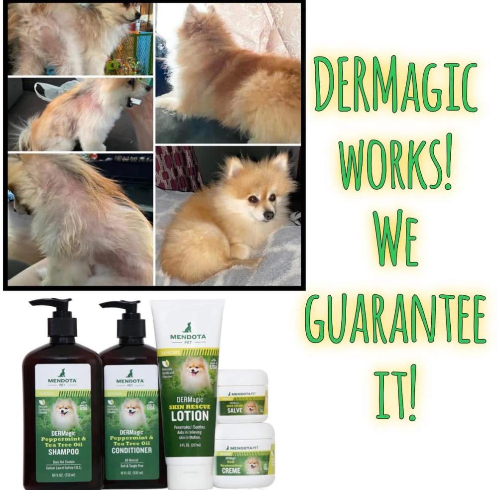 Determined not to lose her dog from a skin disease, Dr. Ritchie began formulating topical prototype products with natural, herbal and organic ingredients. Shenanigan got dunked, slathered, gooped, and drenched in potions, all somewhat effective, but not quite enough. Finally, after a few trials, DERMagic Skin Rescue Lotion was born, and Shenanigan’s relief was visible and immediate. She stopped crying and scratching, and her hair was sprouting again within 48 hours of the first treatment.